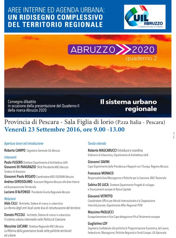 Appuntamento alle 9.00 nella sala Figlia di Jorio della Provincia di Pescara. Dopo l'introduzione di Roberto Campo, segretario generale Uil Abruzzo, interverranno Paolo Fusero, direttore dipartimento di Architettura Ud'A, Giovanni Di Pangrazio, vicepresidente Anci Abruzzo e sindaco di Avezzano, Giovanni Paolo Rosato, coordinatore Anci-Giovani Abruzzo, Andrea Gerosolimo, assessore Regione Abruzzo alle Aree interne ed Associazionismo territoriale, Luciano D'Alfonso, presidente Giunta regionale Abruzzo. A seguire, le relazioni di Aldo Cilli, architetto e dottore di ricerca in Urbanistica, sul tema "La riforma degli enti locali come leva di ristrutturazione del territorio", Donato Piccoli, architetto e dottore di ricerca in Urbanistica, che parlerà de "Il sistema urbano intermedio nella Politica di Coesione", e Massimo Luciani, direttore regionale Anci Abruzzo, su "La Riforma della governance locale nelle politiche territoriali ed urbane".
