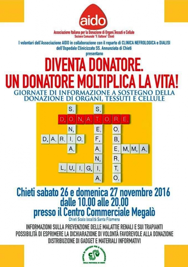 I volontari dell'associazione AIDO Chieti sezione "F.Gattone" nei giorni 26/27 Novembre c.m. dalle ore 10.00 alle ore 20.00 saranno presenti presso la galleria del Centro Commerciale di Megalò -zona Santa Filomena Chieti Scalo . Con la seguente presentazione "Diventa Donatore, Un donatore Moltiplica la vita" con un gesto di consapevolezza e generosità da parte di un donatore post-morte si da la possibilità di salvare 7 vite, organi salva vita come cuore, fegato ,polmone,restituiscono la rinascita nel vero senso della parola a che è appeso ad un "filo" in lista d'attesa per trapianto.
