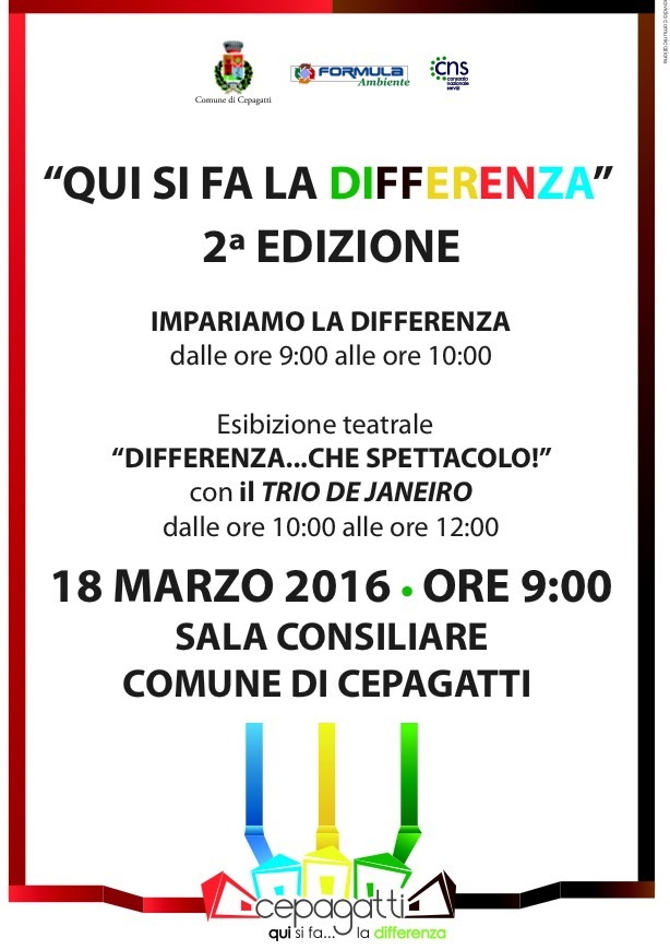 Domani, 18 marzo, presso la Sala Consiliare del Comune di Cepagatti ci sarà la seconda edizione di "Qui si fa la differenza" dalle ore 9 alle ore 10.