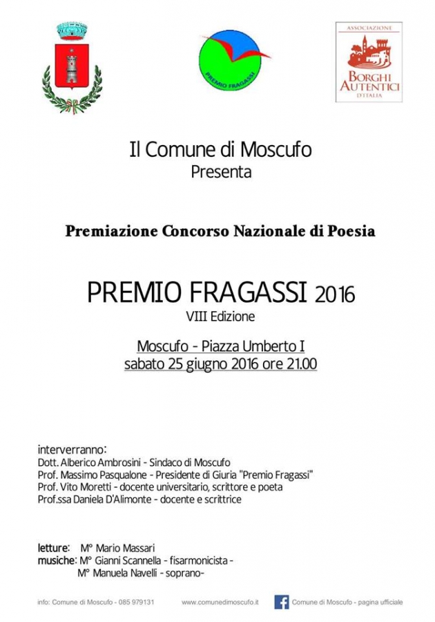 Sabato 25 giugno alle ore 21.00 presso piazza Umberto I di Moscufo, si terrà la cerimonia di premiazione del Concorso Nazionale di Poesia - “Premio Fragassi 2016”; il tema trattato quest'anno è "Oltre i confini" - Poesia è guardare il Mondo con occhi nuovi.