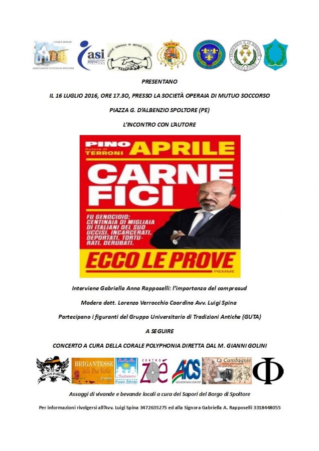 Il 16 luglio 2016, alle ore 17.30, a Spoltore (PE), presso la Società Operaia di Mutuo Soccorso, situata in Piazza G. D'Albenzio n. 1, si terrà l'evento di presentazione del Libro Bestseller Carnefici di Pino Aprile, con la presenza dell'autore, il cui incontro sarà moderato dal giornalista, dottor Lorenzo Verrocchio.