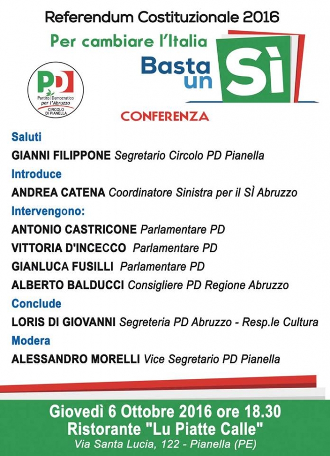 In merito al Referendum Costituzionale 2016, il Circolo PD di Pianella ha organizzato una conferenza per giovedì 6 Ottobre 2016 ore 18:30, presso il Ristorante "Lu Piatte Calle" in Via S. Lucia n° 122 - Pianella (PE).