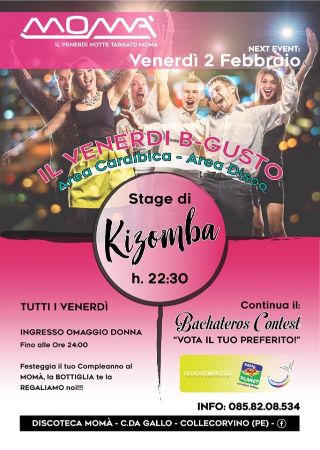 Dalle ore 22.30 stage gratuito di kizomba e successivamente il bachatero contest dove verrà votato il cantante preferito.