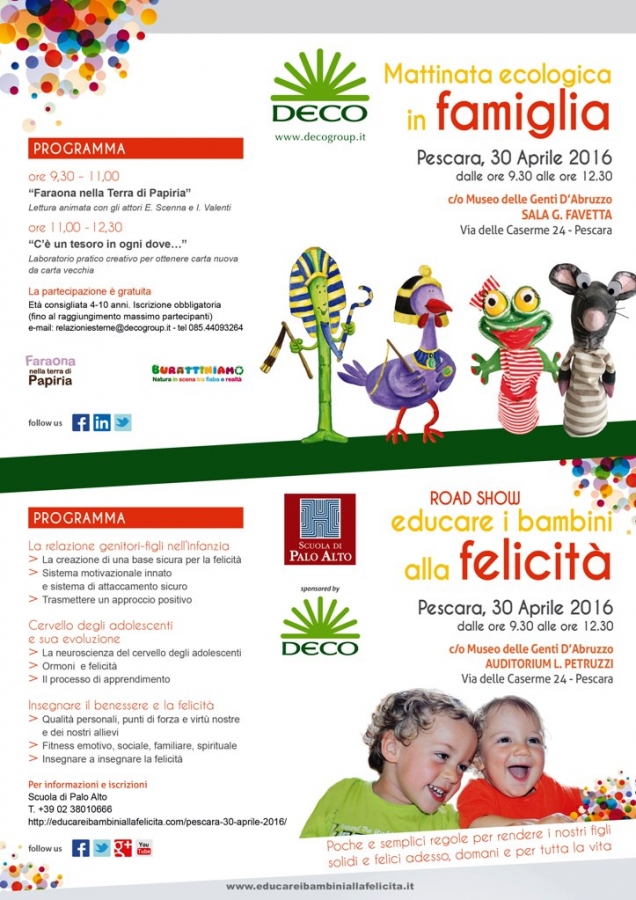 Torna l’evento annuale a cura di Deco S.p.A. - l’azienda abruzzese che opera nel settore ambientale dal 1989 – denominata “Mattinata ecologica in famiglia”, alla sua quarta edizione. L’appuntamento è per sabato 30 aprile, dalle ore 09.30 alle ore 12.30, nei locali dell’Auditorium Petruzzi e della Sala Favetta del Museo delle Genti D’Abruzzo a Pescara
