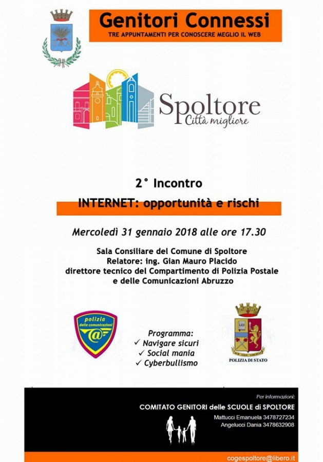 Spoltore - Torna l’appuntamento con “genitori connessi”, la serie di incontri organizzati dal Comitato Genitori  delle Scuole di Spoltore,  in collaborazione con il Comune di Spoltore, finalizzati alla sensibilizzazione verso i temi del web, al fine di riuscire a seguire al meglio i ragazzi nel mondo digitale.