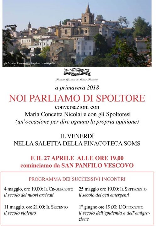 L'antropologa di fama nazionale, Maria Concetta Nicolai, spoltorese, autrice di molteplici pubblicazioni di successo, terrà un ciclo di seminari sulla storia di Spoltore, tutti i venerdì, nella pinacoteca della società operaia di mutuo soccorso di Spoltore.