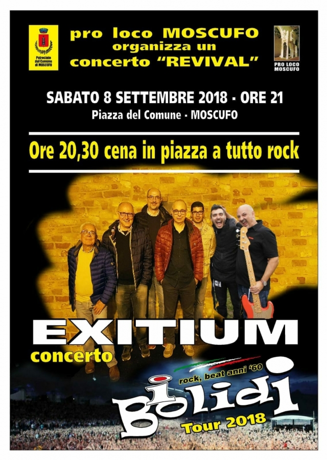 Dalle ore 20.30 in piazza del Comune, ci sarà il concerto degli “ Extium” e della rock band anni ’60 “I Bolidi”.