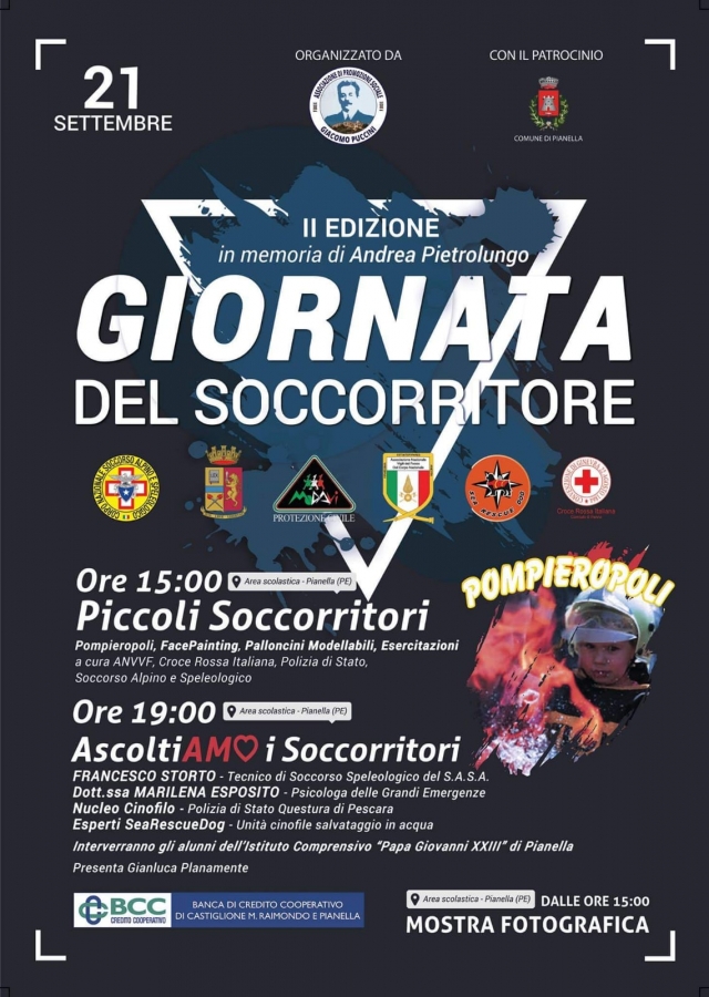 “L’evento, organizzato dal Polo Artistico Culturale e Musicale “G.Puccini”, è giunto ormai alla seconda edizione - spiega l’organizzatore dell’evento Planamente Gianluca - e vuole ricordare il nostro concittadino Pietrolungo, omaggiando nello stesso tempo, tutti i soccorritori. Si concretizza a conclusione del progetto A scuola di soccorso svolto presso il sito comprensivo di Pianella Giovanni Papa 23º che ha visto impegnati i soccorritori della Capitaneria di Porto, Croce Rossa, Vigili del Fuoco e Soccorso Alpino Scanno: un evento in cui c’è stata la possibilità di dialogare e riflettere direttamente con gli alunni tra i banchi di scuola”.