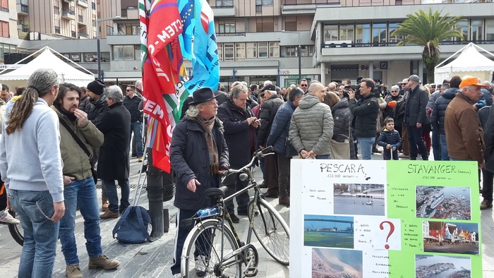 In Abruzzo, sui circa tremila addetti del settore, a rischio i posti di duecento per i quali sono state aperte procedure di mobilità . Senza contare l'indotto. Davanti ai rappresentanti di Filctem Cgil, Femca Cisl e Uiltec Uil i manifestanti hanno esposto cartelloni e foto per mostrare come le pessime condizioni delle acque, in Abruzzo, non siano legate all'estrazione di gas e petrolio.