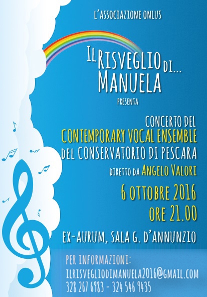 Il Contemporary Vocal Ensemble del Conservatorio di Pescara, diretto dal maestro Angelo Valori, si esibirà all’ex Aurum, giovedì 6 ottobre, alle ore 21.00, in memoria di Manuela Verna, infermiera di Spoltore, entrata in coma a seguito di un'emorragia celebrale nel luglio 2012 e morta il 26 aprile 2016, dopo un lungo calvario. L’evento è stato organizzato dalla neo Associazione Onlus ‘Il Risveglio di Manuela’, fondata dai genitori dell’infermiera Anna ed Ezio Verna, ed è patrocinata dai Comuni di Pescara e Spoltore. Il concerto è gratuito, ma sarà possibile donare un’offerta. Il ricavato sarà devoluto all’Associazione.