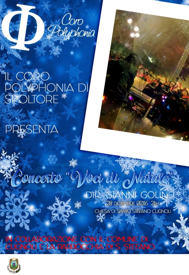 Il Coro Polyphonia di Spoltore, con la collaborazione del Comune di Cugnoli e la Parrocchia Santo Stefano, parteciperà al concerto "Voci di Natale", previsto per domani 28 dicembre. L'evento si svolgerà presso la chiesa di Santo Stefano dello stesso comune pescarese.