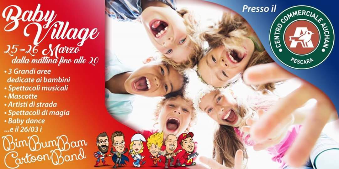 Arriva al CENTRO COMMERCIALE AUCHAN PESCARA  la prima edizione del BABY VILLAGE - 25/26 Marzo 2017 - il primo villaggio fatto di stand ed intrattenimenti dedicati ai bambini ed alle loro famiglie, il tutto realizzato, per l'occasione, nella cornice di un Centro Commerciale.