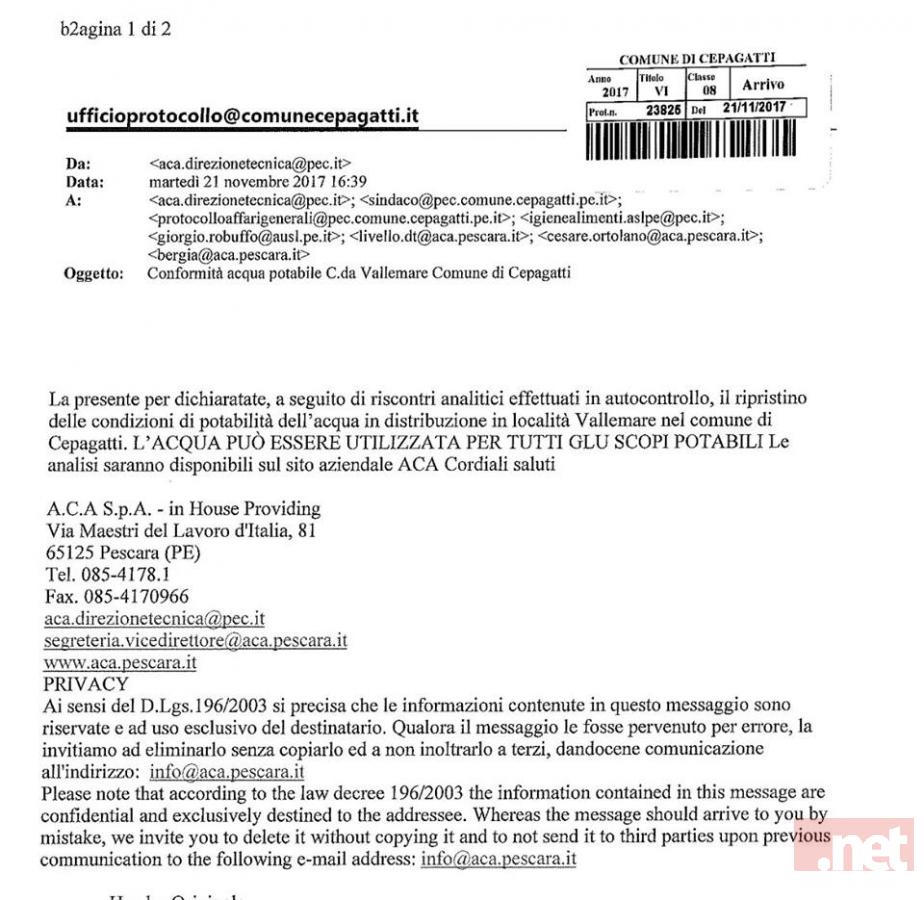CEPAGATTI- Il comune di Cepagatti, attraverso una nota, comunica che in contrada Vallemare l'acqua distribuita nelle condotte è tornata potabile. Questo a seguito di controlli analitici effettuati dall'ACA, e pubblica la comunicazione stessa emessa dall'ente di distribuzione.