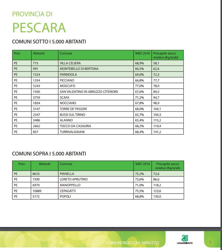 I Comuni Ricicloni (il 47% del totale dei Comuni abruzzesi) hanno superato il 65% di raccolta differenziata. Di essi, 41 sono anche "Rifiuti Free" (il 29% dei Ricicloni e il 14% del totale dei Comuni abruzzesi). Altra nota positiva sono i 4 consorzi che si posizionano anch'essi al di sopra del 65% di raccolta differenziata e sono: Consorzio Chietino, Cirsu, Ecolan e Segen.