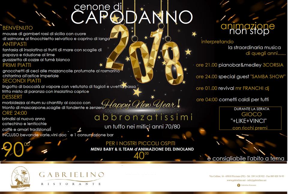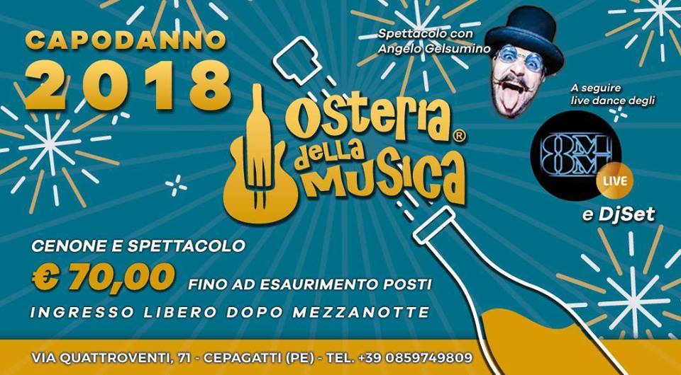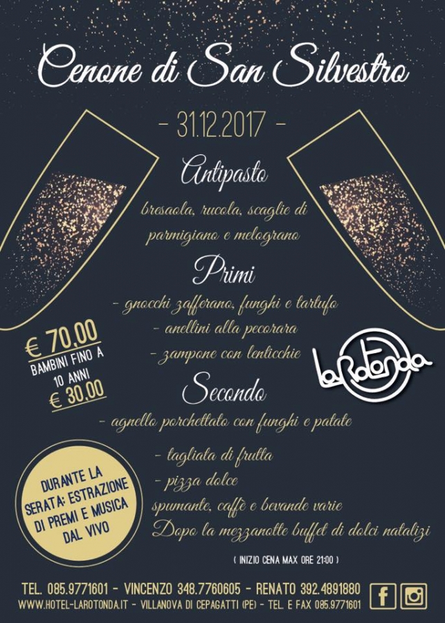 Spostandoci su Cepagatti, a Villanova, il menù proposto dal Funky Fish è di solo pesce a soli 50€; gratis invece l'ingresso al SecretPass, sempre a Villanova; mentre al ristorante la Griglia di Cepagatti cenone con musica live con Paolo Di Lullo e i Lord, Sara Music live nella sala braceria. Al Ristorante La Rotonda menù da 70,00€.