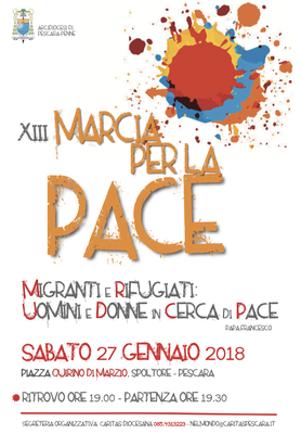 Si terrà a Spoltore (Pe), sabato 27 gennaio 2018, con raduno e partenza da Piazza Quirino Di Marzio alle ore 19:00, la XIII edizione della Marcia per la Pace organizzata dall'Arcidiocesi Pescara-Penne. Come di consueto, il tema che ispirerà le riflessioni, che si terranno lungo il percorso, sono ispirate al titolo del messaggio di Papa Francesco in occasione della Giornata Mondiale della Pace, celebrata in tutto il mondo il 1 gennaio 2018, "Migranti e rifugiati: uomini e donne in cerca di pace".