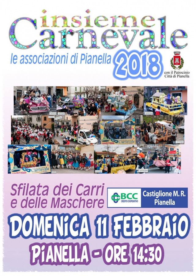 Dopo l’assenza dello scorso anno, dovuta alla tragedia di Rigopiano, le associazioni locali, in particolare, la Pro Loco, Ambiente e/è Vita, Bikersclub, Sporting, Ama Pianella, con il patrocinio dell’amministrazione comunale, sono pronte a riproporre la sfilata dei carri e delle maschere per la festa di carnevale.
