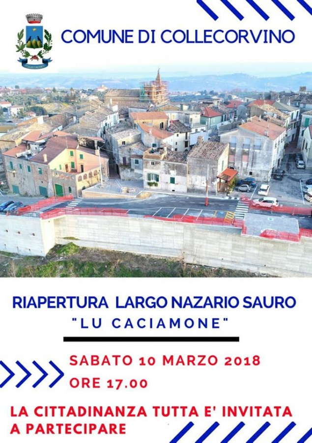 L'amministrazione Comunale di Collecorvino ha invitato tutta la cittadinanza alla riapertura del Largo Nazario Sauro conosciuto come "Lu Caciamone" sabato 10 marzo 2018 alle ore 17:00 per l'apertura ufficiale dove sarà offerto anche un rinfresco.