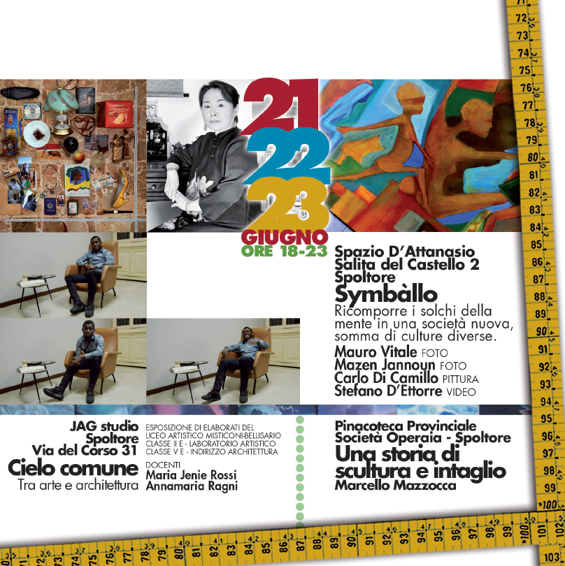 La XIX edizione de I Colori del Territorio presenta Symballo, un contenitore che in 6 date tra il 15 e il 24 giugno 2018 porta a Spoltore (più un evento conclusivo a Pescara) il tema dell'integrazione e della somma di culture diverse. "Symballo" significa infatti "mettere insieme" ed è il titolo della mostra che, dal 21 al 23 giugno (ore 18-23), riempirà lo Spazio D'Attanasio nel centro storico con i lavori di Mauro Vitale, Mazen Jannoun, Carlo Di Camillo e Stefano D'Ettorre. Uno sguardo sul fenomeno dell'immigrazione nella Val Pescara focalizzato sui casi di integrazione con la nostra cultura.