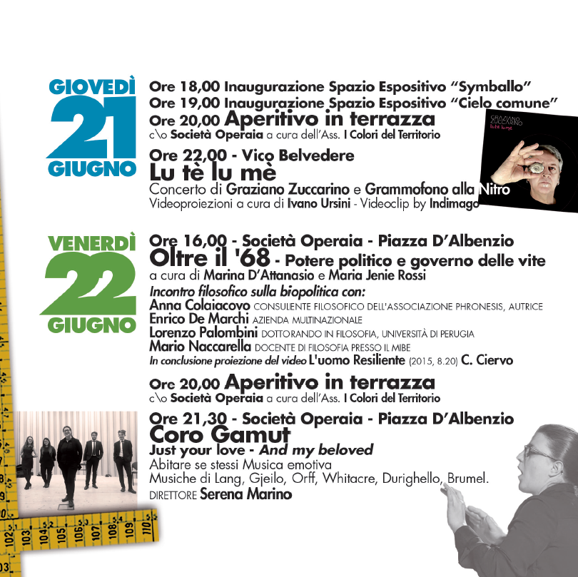 Giovedì 21 giugno alle 22.00 il vico Belvedere ospita il concerto "Lu tè lu mè" di Graziano Zuccarino e Grammofono alla Nitro. Il 22 giugno alle 21.30, nella sede della Società Operaia, il Coro Gamut, diretto da Serena Marino, intepreta musiche di Lang, Gjeilo, Orff, Whitacre, Durighello, Brumel.