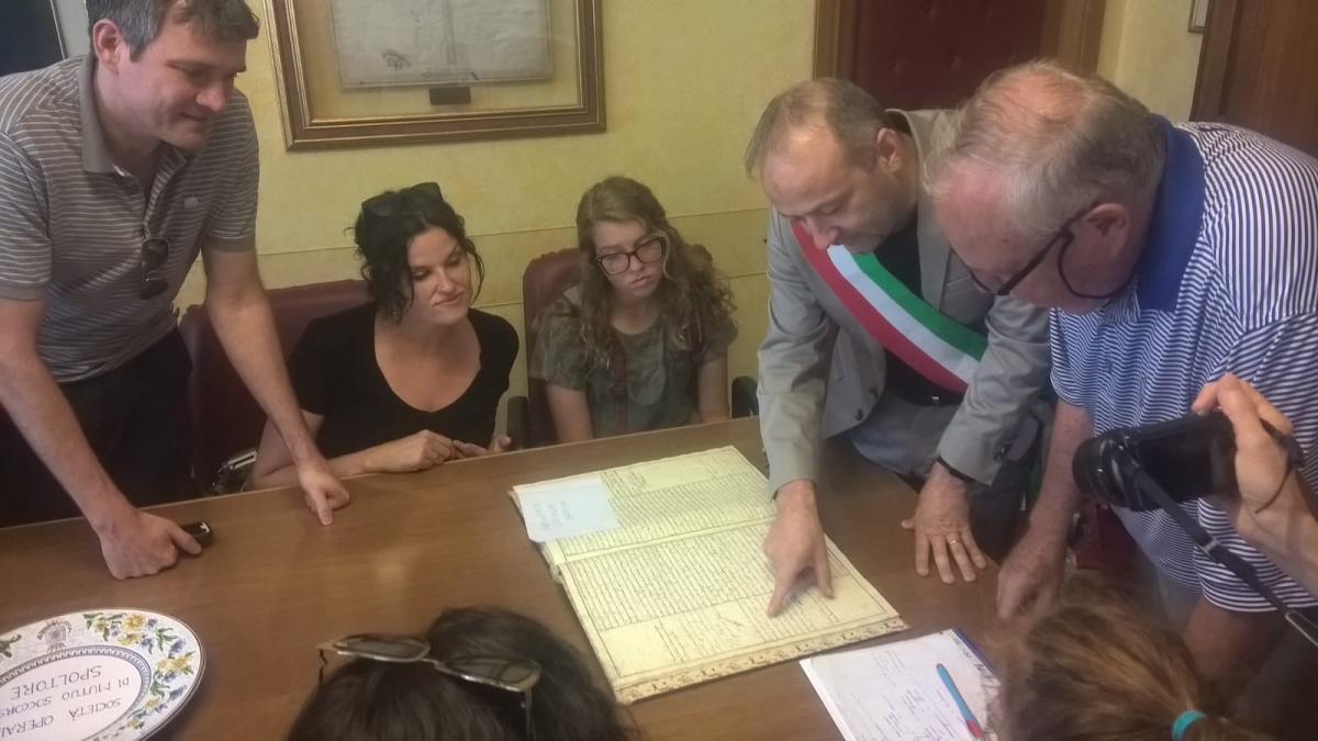 Centoquindici anni fa, Annunziato Crisante lasciava contrada Montesecco e partiva per Steubenville, in Ohio, dove con il tempo si è creata una nutrita comunità di persone originarie di Spoltore: persone costrette dalla povertà a lasciare la propria terra ma che hanno dato ai loro figli la possibilità di tornare a visitarla. Ieri mattina in Comune il sindaco Luciano Di Lorito ha accolto gli avi di Annunziato, capitanati da suo nipote Bob Crisante: con lui la moglie Amie e i 4 figli Beth, Michael, Katherine e Kristen Cresante (il loro cognome è stato americanizzato così negli Stati Uniti). In Italia sono volati anche il marito di Beth, Craig Hart con loro 3 bimbi Lucy, Sam e Carly. Vivono a Cleveland, a un paio di ore da Steubenville: e se i Crisante erano una famiglia di contadini, tra di loro oggi ci sono insegnanti e ingegneri. Sono nella nostra regione guidati da Luciana Masci del Touring Abruzzo, proprio per scoprire i luoghi dove ha avuto origine la loro famiglia. In Comune hanno consultato gli atti originali, dell'800, sullo stato civile dei loro progenitori. "E' stato un momento emozionante" ha commentato il sindaco, e ha ricordato che anche tra i suoi parenti c'è chi ha raggiunto Steubenville. Lo testimonia anche la presenza, tra i Councilman oggi in carica della città , di Gerard DiLoreto. "Ho già preso contatti con la municipalità statunitense per creare un legame anche istituzionale con Spoltore". Al termine uno scambio di doni con la famiglia Crisante: miele e senape della squadra locale per il Sindaco, la copia degli atti e i libri sulla storia di Spoltore di Maria Concetta Nicolai e Giustino Pace per gli statunitensi.