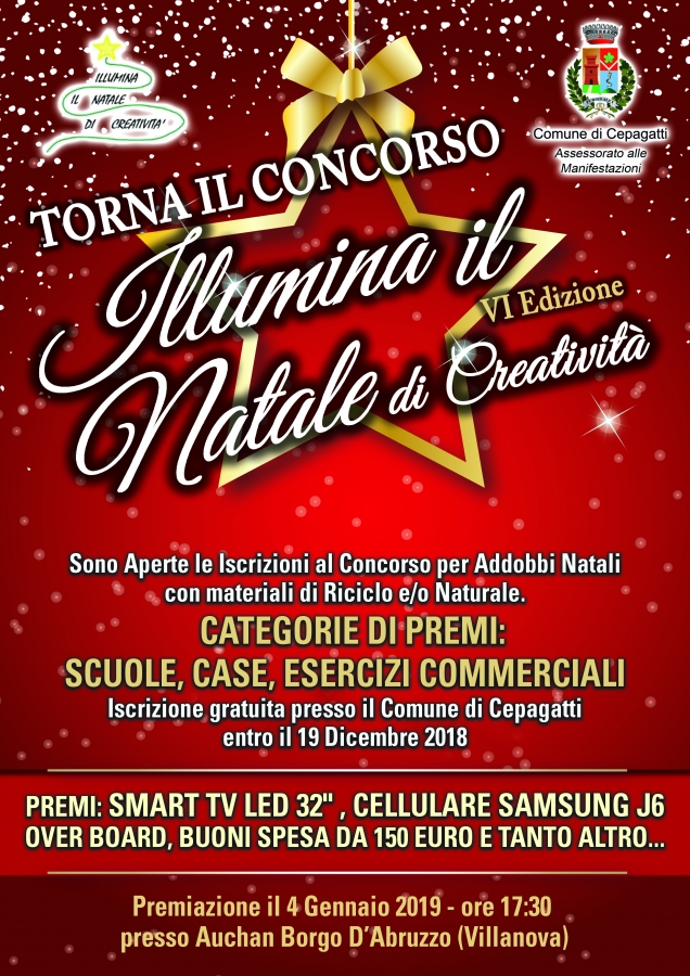 A seguito del grande successo delle passate edizioni, il Comune di Cepagatti, Assessorato agli Eventi e Manifestazioni, organizza la VI edizione di “Illumina il Natale di Creatività”, il concorso natalizio dedicato alla creatività e alla sostenibilità, aperto a tutte le scuole, i cittadini e le attività site nel comune di Cepagatti che con addobbi, presepi ed alberi realizzati in materiale naturale e/o di recupero si siano impegnati a ravvivare la nostra città durante il periodo natalizio.