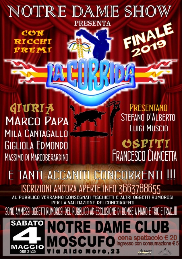 Una serata sold out all’insegna del divertimento e dell’allegria quella di ieri sera al pub/pizzeria “Notre Dame” di Moscufo (PE) in occasione della finalissima dell’edizione 2019 della Corrida, la caratteristica manifestazione che vede salire palco i dilettanti alla sbaraglio.