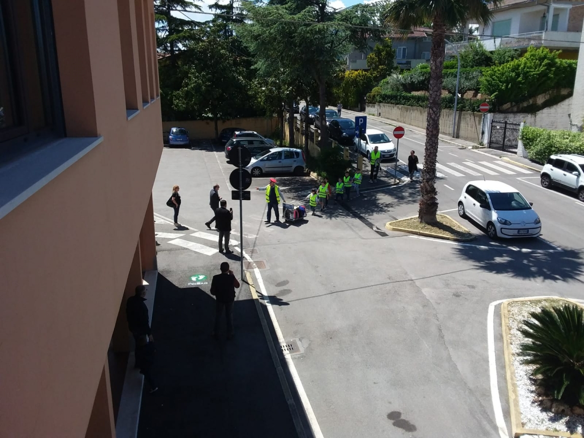 I primi giorni del Pedibus sono stati un successo: il punto di raccolta è sotto il portico del Municipio, dal quale i bambini si muovono percorrendo il lato sinistro del marciapiedi di via Gioacchino Di Marzio, fino alle strisce pedonali di fronte al cancello di ingresso dell'istituto di scuola primaria. Al ritorno, il punto di raccolta è all'interno del cancello adiacente il marciapiede. Ogni linea del pedibus al momento conta 20 posti: per iscriversi è disponibile un modulo sul sito internet istituzionale.