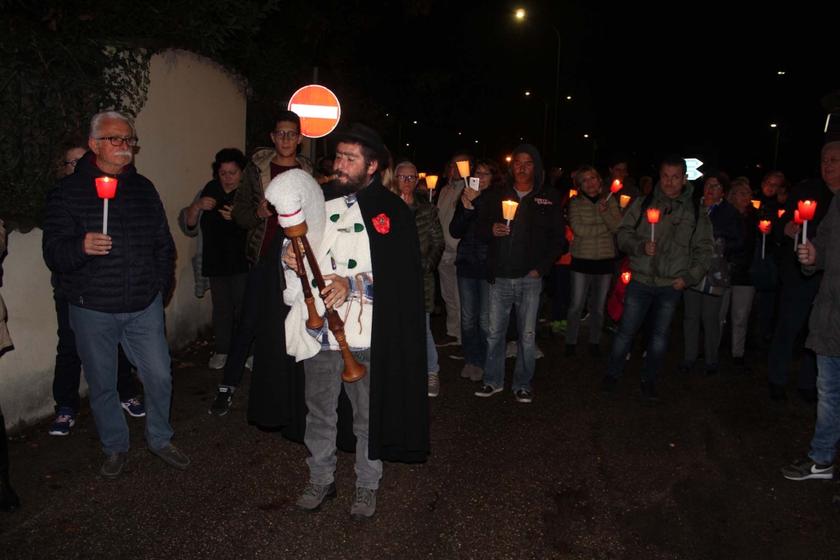 Oltre duecento persone hanno partecipato alla rievocazione storica de ‘La Tavola dei Morti’, la manifestazione promossa per il sesto anno consecutivo dall’Associazione Fontevecchia, con il patrocinio della Presidenza del Consiglio della Regione Abruzzo e del Comune di Spoltore, nella notte tra il primo e 2 novembre lungo i vicoli del Borgo Case Troiano. Ad animare la tradizione sono state le figure allegoriche della Processione dei Frati Morti, de Lu’ Mazzamurille’, il Pulcinella abruzzese, trait d’union tra il mondo dei vivi e quello dei morti, i Cavalieri erranti, le anime del Purgatorio, le anime pezzentelle, e le Zampogne, per riscoprire alla fine del percorso, attraverso la narrazione teatralizzata, il rito tutto abruzzese del lasciare le tavole imbandite in quella notte speciale per accogliere il ritorno e il transito delle anime dei cari defunti. Un percorso negli aneddoti e nelle storie raccontate dai nostri nonni che mira quindi alla riscoperta dei riti legati alla commemorazione dei defunti tipicamente italiani e che nulla hanno a che vedere con Halloween. “Con la ‘Tavola dei Morti’ – ha ricordato il Presidente dell’Associazione Fontevecchia Troiano aprendo la manifestazione alla presenza dell’assessore alla Cultura del Comune di Spoltore Roberta Rullo -, celebrazione che non ha nulla a che vedere con le feste anglosassoni, vogliamo raccontare ai più giovani e riportare alla luce una tradizione importante per la nostra storia, appunto il dovere di onorare nella maniera più giusta, rispettosa e opportuna quelle persone che hanno fatto parte della nostra vita e che in quella notte, vuole la narrazione, tornano nelle loro case per un breve attimo, a salutare i propri cari. Tradizione del centro-sud vuole che in quella notte le famiglie lascino la tavola imbandita come nei giorni di festa, con le migliori cibarie del mondo contadino, maccheroni al sugo, pollo al forno con le patate e la pizza dolce, proprio per dare il benvenuto ai propri cari”. L’evento, completamente gratuito, ha preso il via alle 19, dinanzi alla sede della Motorizzazione civile, con il ‘Racconto dei Luoghi’, e, con la sola luce delle candele al suono delle zampogne del maestro Matteo Di Marco, è partito il cammino verso il Borgo Case Troiano, seguendo un percorso delimitato dai lumini, e con alcune pause, ciascuna delle quali è stata caratterizzata da un racconto su vicende e personaggi che hanno caratterizzato il Borgo stesso. Lungo la stradina del borgo, alla ‘vutate de lo lope’, si è incrociata la Processione dei Frati Morti accompagnati dai Cavalieri erranti di Marco De Marinis e la Compagnia di Rievocazione medievale, con la storia dei ‘tre vivi e tre morti’, che ha accompagnato i presenti sino all’oliveto dove ad aspettare il pubblico c’era ‘Lu’ Mazzamurille’, spiritello dispettoso abituato a prendersi gioco dei vivi, e la ‘tomba del Cavaliere’. All’ingresso del Borgo Case Troiano è stato allestito l’Altare devozionale per le anime del purgatorio, con la rappresentazione della Processione dei Frati ricostruita dal Maestro presepista di Napoli Aldo Vucai, e quindi la tappa nell’aia con il combattimento mortale tra i Cavalieri erranti. Infine la visita delle abitazioni con le tavole imbandite per la cena accompagnati dal ‘Cantore di Ognissanti’ e dal suono delle zampogne. All’esterno di ogni abitazione l’illustrazione dei simboli, come il sacchetto di grano, la scopa rovesciata, la bacinella, il bastone, e, ogni volta, la scoperta delle ragioni di quelle presenze che affondano le radici nella tradizione abruzzese. Durante la serata è stato possibile rendere omaggio alla Chiesa della Santissima Trinità, situata nel borgo, regolarmente aperta: l’ingresso è stato caratterizzato dalla presenza di un ‘Pulcinella abruzzese’, quale trait d’union tra il mondo dei vivi e quello dei morti, e, secondo le antiche credenze, il primo che è entrato ha liberato un’anima del Purgatorio. Al termine dell’evento, rigorosamente gratuito, a tutti i partecipanti è stato offerto il ‘cibo penitenziale’, “un cibo povero contrapposto a quello ricco delle tavole, proprio perché la tavola imbandita doveva essere riservata ai defunti”, ha ricordato il Presidente Troiano. Dunque anche il cibo rituale è stato rigorosamente rispettoso della tradizione, costituito da ‘il grano dei morti’, ossia grano saraceno bollito con noci, melograno e mosto cotto, fave lesse, ceci abbruscati, zucca e patane e vino rosso, un’occasione dunque per riscoprire una tradizione diffusa in tutto il meridione sino agli anni ’60 e che purtroppo si è andata perdendo. Sabato 9 novembre, per il terzo anno consecutivo, l’evento verrà replicato a Napoli con la ‘Processione dei Frati Morti’, evento che aprirà di nuovo il ricco cartellone del lungo Natale partenopeo, dove l’Associazione Fontevecchia sarà affiancata dagli amici dell’Associazione culturale ‘Camminando Insieme’ di Chieti, che conta oltre cento soci, e a Napoli sarà accolta dall’Associazione de ‘I Sedili di Napoli’, con i quali si riporterà alla luce anche la tradizione partenopea de ‘Le Cascettelle dei Morti’.