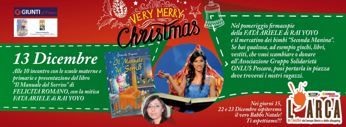 “Venerdì, presso una delle sale del Multiplex Arca di Spoltore – interviene Felicita Romano - avrò la piacevole occasione di presentare il mio terzo libro Il manuale del sorriso. Con me la giornalista Alessandra Renzetti, con la quale racconteremo il testo, ci sarà la fatina Ariele da Rai Yoyo che ci accompagnerà in questa nuova avventura, leggendone alcune parti. All'evento, sono state invitate diverse scuole materne ed elementari del pescarese, in alcune delle quali, nelle ultime settimane, ho potuto svolgere laboratori di "lettura espressiva animata", proprio partendo dal contenuto dei miei libri. Per questo, sono onorata e ancor più felice di poter prendere parte, con il mio libro, agli eventi natalizi previsti dall'Arca di Spoltore e poter così parlare a tantissimi bambini. Ringrazio infatti, presidi, insegnanti, dirigenti per aver dato la possibilità ai piccoli di partecipare all’evento”.