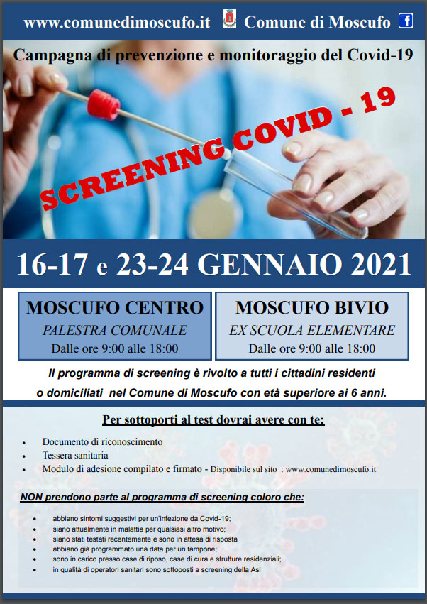Nelle giornate di Sabato e Domenica 16-17 e 23-24 gennaio avrà luogo a Moscufo lo SCREENING volontario per il Covid-19. Saranno organizzate due postazioni: una presso la palestra comunale e l'altra nell'ex scuola in c.da Bivio Casone.