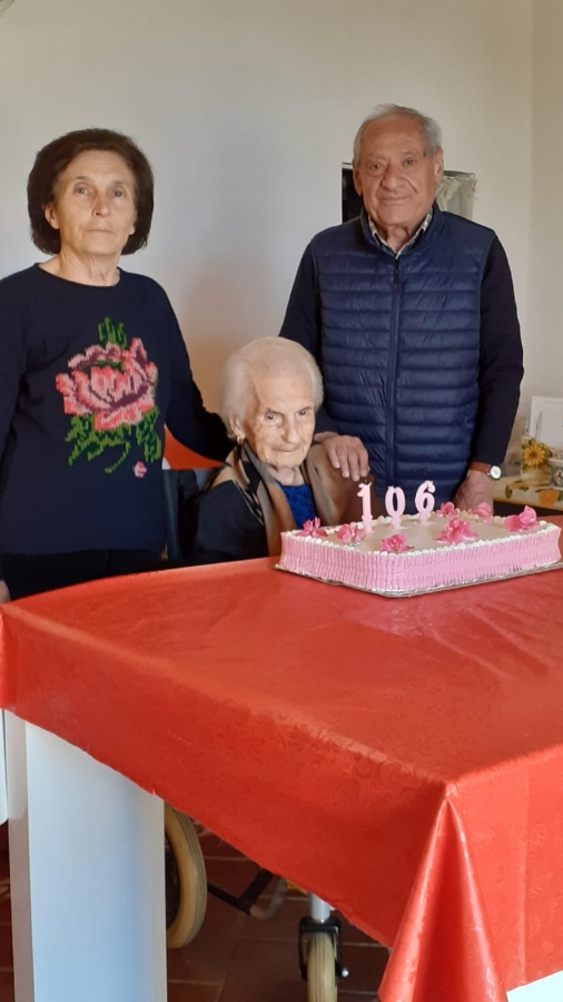 E' la più anziana di Spoltore: Paolina D'Andrea, classe 1915, compie oggi (7 aprile 2021) 106 anni. L'emergenza sanitaria ha ridotto i festeggiamenti ai familiari conviventi, e ha tenuto lontana anche l'unica nipote diretta, Elena, che è un medico e lavora fuori regione. Ma Paolina è stata comunque raggiunta telefonicamente dal sindaco Luciano Di Lorito. L'augurio è ovviamente di poter festeggiare meglio il prossimo anno: "presto il Covid passerà " l'ha rassicurata il primo cittadino "e tutti i parenti, compresa sua nipote, torneranno a trovarla". Certamente la pandemia non è di aiuto, rendendo impossibile le visite che sono di forte stimolo per i più anziani. "Le sue condizioni non sono certo quelle di due anni fa e ha un maggior bisogno di riposo" ricorda la figlia Rosalina, che si prende cura di lei e nel 2019 aveva accolto Di Lorito nella sua casa per la classica consegna della targa ricordo. Ma tutto sommato è ancora in condizioni di salute invidiabili: Paolina, una vita da contadina senza mai toccare un bicchiere di vino, ha sempre mangiato un po' di tutto, pur limitando negli ultimi anni la carne. Nella foto con la torta, ci sono la figlia Rosalina, e il genero Vito Montebello. Paolina è nata in una casetta a 500 metri dal ristorante "La Bandiera" a Civitella Casanova, che anche per questo è stato scelto quando ha festeggiato i 100 anni: dal 1969 è a Spoltore. Fisico ancora longilineo, lo stesso di Rosalina ed Elena, viene da una famiglia molto longeva: in 6 tra fratelli e sorelle, solo uno di loro non ha superato i novant'anni e la sorella Maria Giulia (del 1911) si è fermata a 102 anni e 8 mesi.