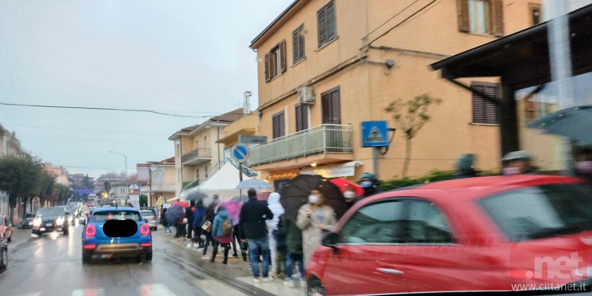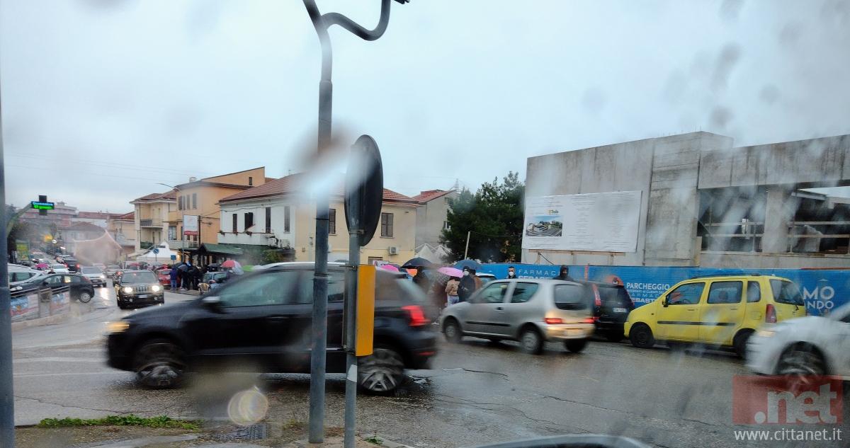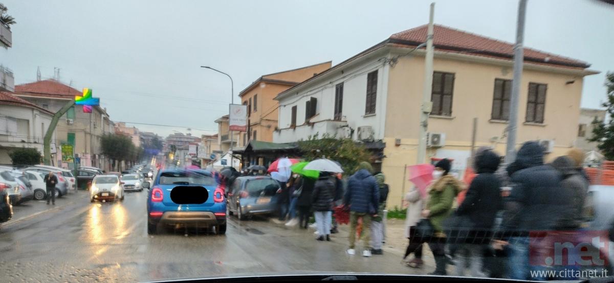 Anche a causa della mancanza di parcheggi, diverse auto sostano proprio di fronte l'incrocio che al termine di via Italia conduce verso Pescara. Le persone in fila occupano pertanto anche parzialmente la sede stradale.