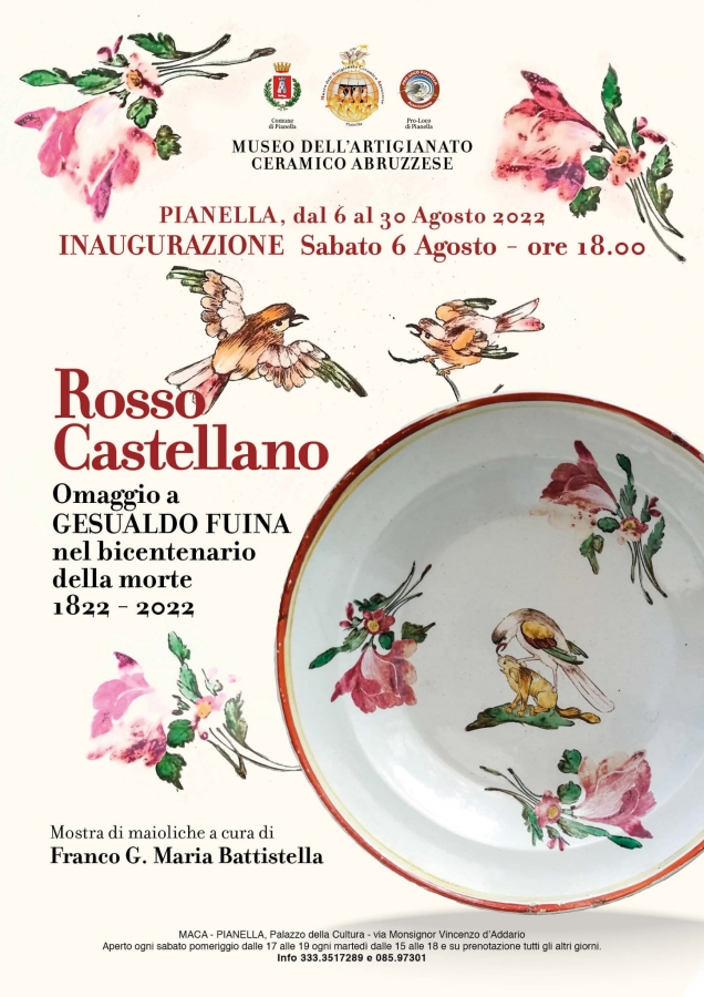 Sabato 6 agosto alle ore 18, a distanza di una settimanadall’inaugurazione della mostra sulla ceramica Polci di Pescara a cura da Alessandro Morelli, il Museo dell’Artigianato Ceramico Abruzzese di Pianella presenta una nuova esposizione di maioliche, per ricordare nel bicentenario della morte Gesualdo Fuina, il pittore di Castelli noto per aver ampliato col colore rossola tavolozza cromatica in uso nelle botteghe locali (da qui il titolo “Rosso Castellano. Omaggio a Gesualdo Fuina nel bicentenario della morte 1822-2022”).
