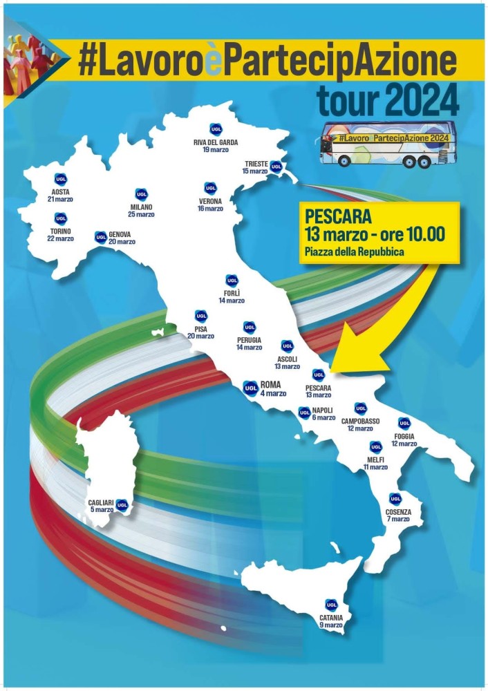 Il “Lavoro è partecipazione tour” farà tappa a Pescara, mercoledì 13 marzo, alle ore 10, in piazza della Repubblica. Il tour è una iniziativa della Ugl e a bordo del bus viaggia il segretario generale Paolo Capone, accompagnato dai segretari confederali.
