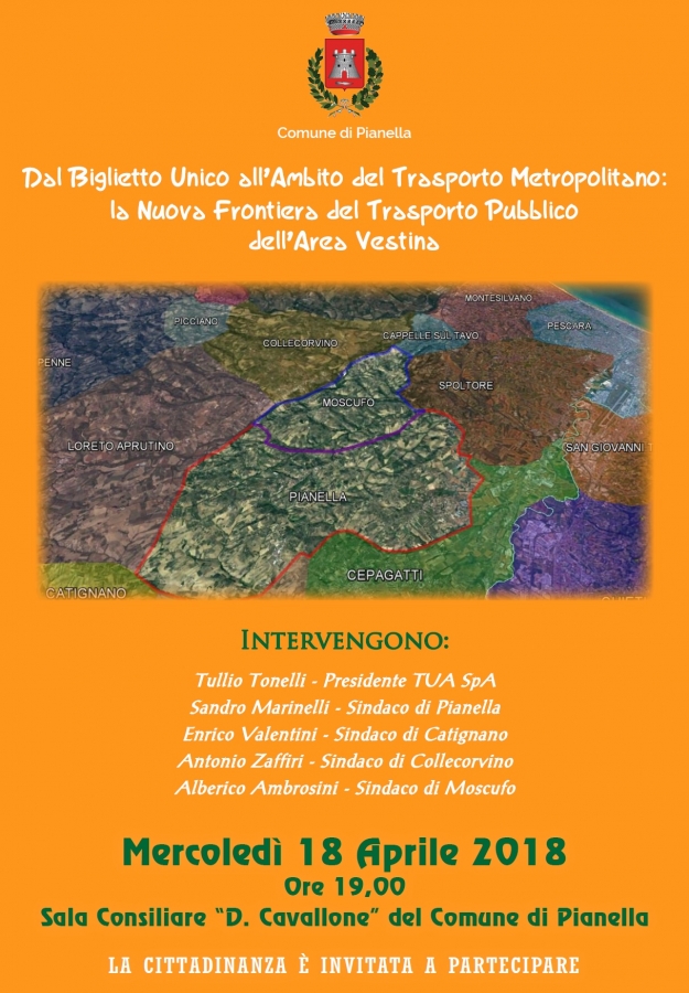 A seguito dell’incontro organizzato lo scorso 18 aprile presso il comune di Pianella, dove è stato possibile illustrare, alla presenza dei Sindaci e degli amministratori dell’area vestina, la relazione del Presidente della società di trasporti abruzzesi TUA SpA Ing. Tullio Tonelli inerente il progetto di sviluppo del trasporto dell’area metropolitana, il Comune di Pianella ha inoltrato formale richiesta alla Regione Abruzzo per ottenere l’estensione del perimetro del biglietto unico anche al territorio pianellese in attesa che si completi il più articolato ed innovativo percorso necessario per giungere all’attuazione del progetto della società dei trasporti stessa.