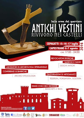 Dopo il grande successo delle prime tre edizioni viene riproposta anche quest’anno nel fine settimana 15/17 luglio la manifestazione “Antichi Vestini, dalla terra ai sapori alle tradizioni”, un suggestivo ed ulteriormente arricchito percorso tra archeologia, convegni, laboratori artigianali, e antichi sapori, che interessa lo storico Castello Marcantonio, con la sua suggestiva area archeologica, e l’intero plurisecolare borgo di Cepagatti, alla riscoperta delle più antiche origini del territorio degli antichi Vestini.