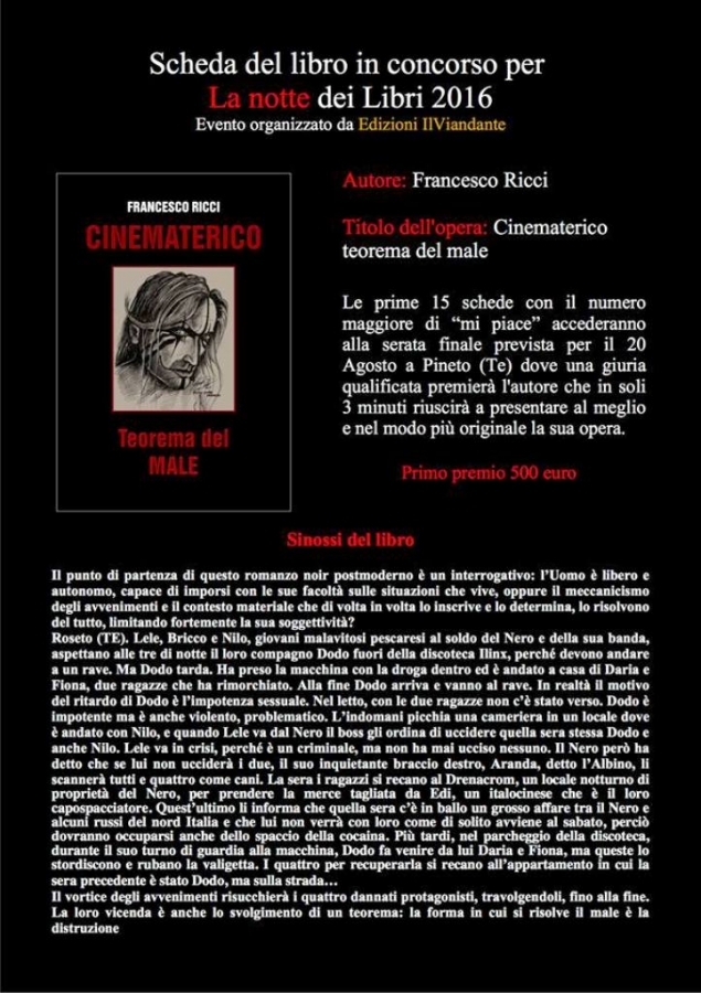 Il mio romanzo Cinematerico di Francesco Ricci, presentato anche a Cepagatti (leggi qui http://www.collinedoro.net) partecipa al concorso su Facebook “La notte dei libri 2016”.