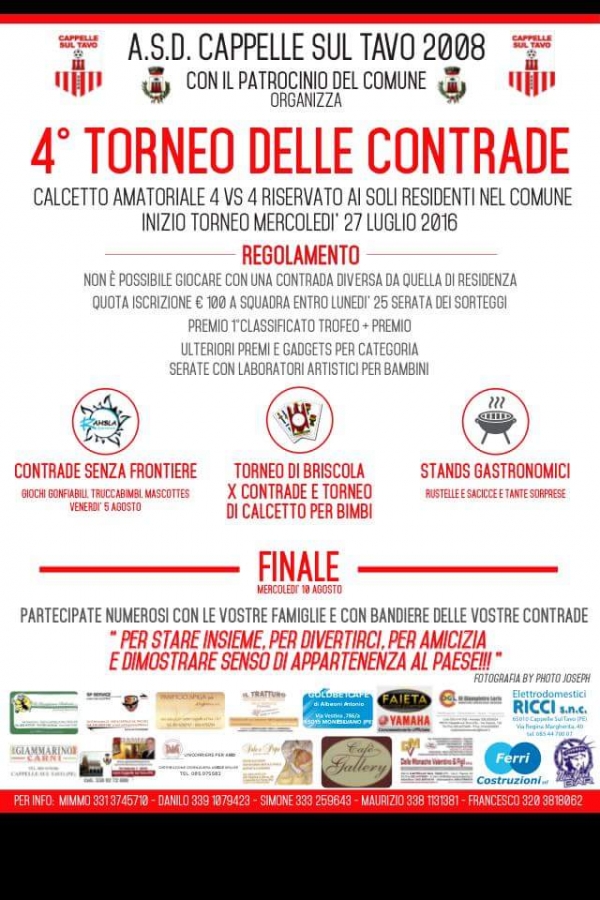 Tutti coloro che vorranno, potranno partecipare inviando le foto stampate su foglio A4 entro il 25 luglio 2016 all’indirizzo Fam. Poli Roberto e Teresa – C.da Colle di Giogo, 82 65010 Moscufo (Pe); è possibile altresì contattare la Sig.ra Angela Di Sabatino al numero 347.4374476 o all’indirizzo mail a.disabatino11@gmail.com.