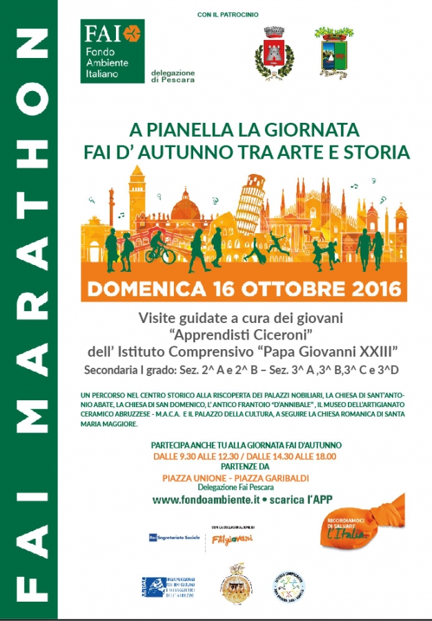 Quest'oggi, domenica 16 ottobre 2016 dalle ore 9:15 alle ore 21:00, l'Associazione Archeoclub d'Italia Onlus - Sede di Cepagatti sarà presente all'evento del FAI MARATHON, nel centro storico di Pianella, con un allestimento degli "Antichi Abiti Abruzzesi" presso i locali concessi gentilmente da Livio Pagannone ed un allestimento della "Bottega dei Mastri Carrai" dedicato all'ultimo mastro carraio di Cepagatti, nostro caro amico compianto Bruno Marani, ad un anno esatto dalla sua scomparsa.