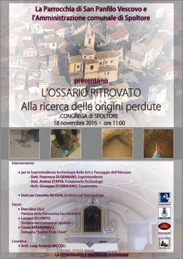 L’Amministrazione comunale di Spoltore e la Parrocchia di San Panfilo Vescovo entro le mura organizzano il convegno: “L’Ossario ritrovato - alla ricerca delle origine perdute”, domani (venerdì 18 novembre), alle ore 11.00. Al centro dell’incontro, che si svolgerà all’interno della cripta, la scoperta di un “locale ipogeo”, una costruzione sotterranea di notevole interesse storico e antropologico trovato nella congrega della Parrocchia.