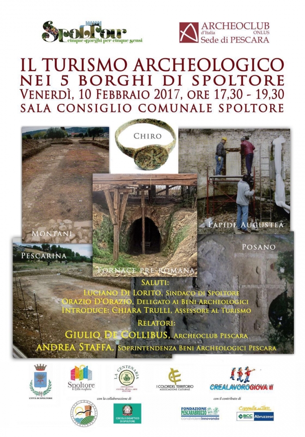 Proseguono le iniziative di promozione turistica del territorio. Domani (venerdì 10 febbraio), alle ore 17.30, nella Sala Consiliare di Palazzo di Città, si svolgerà l’incontro: “Il turismo archeologico nei cinque borghi di Spoltore”, promosso dall’Amministrazione comunale nell’ambito del progetto ‘Spoltour’ con la collaborazione dell’Archeoclub d’Italia Onlus - sede di Pescara.