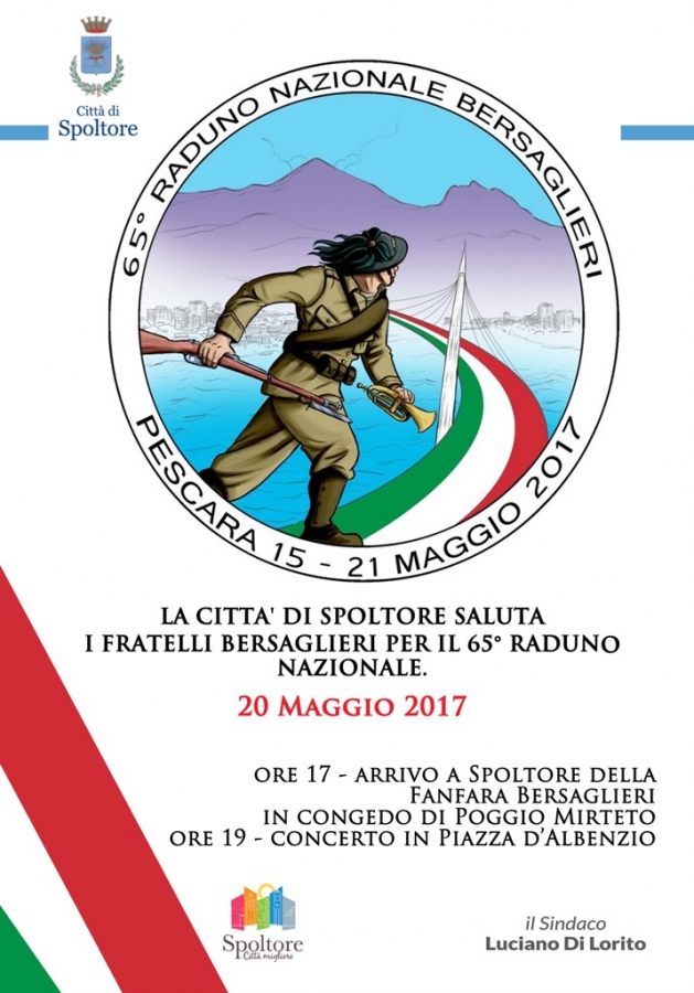 "La città di Spoltore" si legge nel manifesto affisso in città "saluta i fratelli bersaglieri per il 65° raduno nazionale". Il 20 maggio, poi, arriverà a Spoltore la sezione e la fanfara Bersaglieri in congedo di Poggio Mirteto: sfileranno con marce bersaglieresche nelle vie del capoluogo a partire dalle ore 17, fermandosi davanti al monumento ai caduti per un omaggio floreale. Alle 19, inoltre, si fermeranno in Piazza D'Albenzio per un concerto con marce, brani sinfonici e colonne sonore cinematografiche: lo spettacolo durerà circa un'ora.