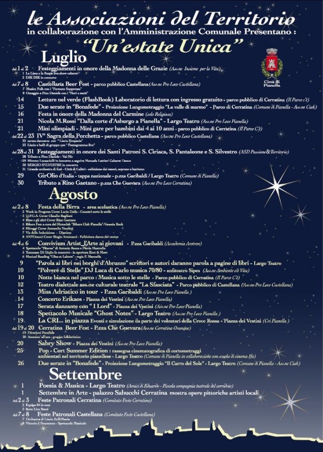 Anche quest’anno numerosi eventi allieteranno cittadini e turisti, appuntamenti numerosissimi che arrivano fino a settembre, iniziative proposte quasi quotidianamente dalle Associazioni del territorio in collaborazione con il Comune di Pianella.