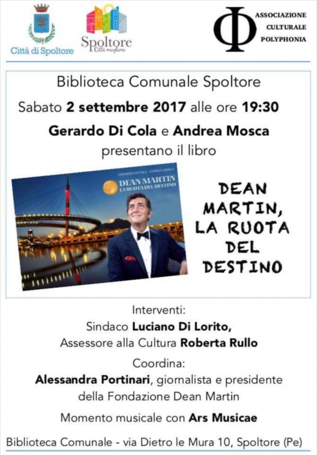 Sarà un incontro dedicato a Dean Martin a concludere il primo ciclo di presentazioni nella Biblioteca Comunale di Spoltore: l'appuntamento è per sabato 2 settembre (ore 19.30) con il volume "Dean Martin, la ruota del destino" di Gerardo Di Cola e Andrea Mosca.