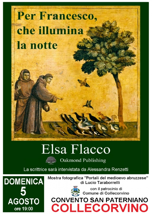 Domenica 5 agosto infatti, alle ore 19, ospiterà la presentazione di un romanzo che sta facendo un vero tour in Italia, ed è quello di Elsa Flacco, “Per Francesco, che illumina la notte”. La scrittrice illustrerà ai presenti il frutto del suo lavoro e risponderà alla domande della giornalista Alessandra Renzetti.