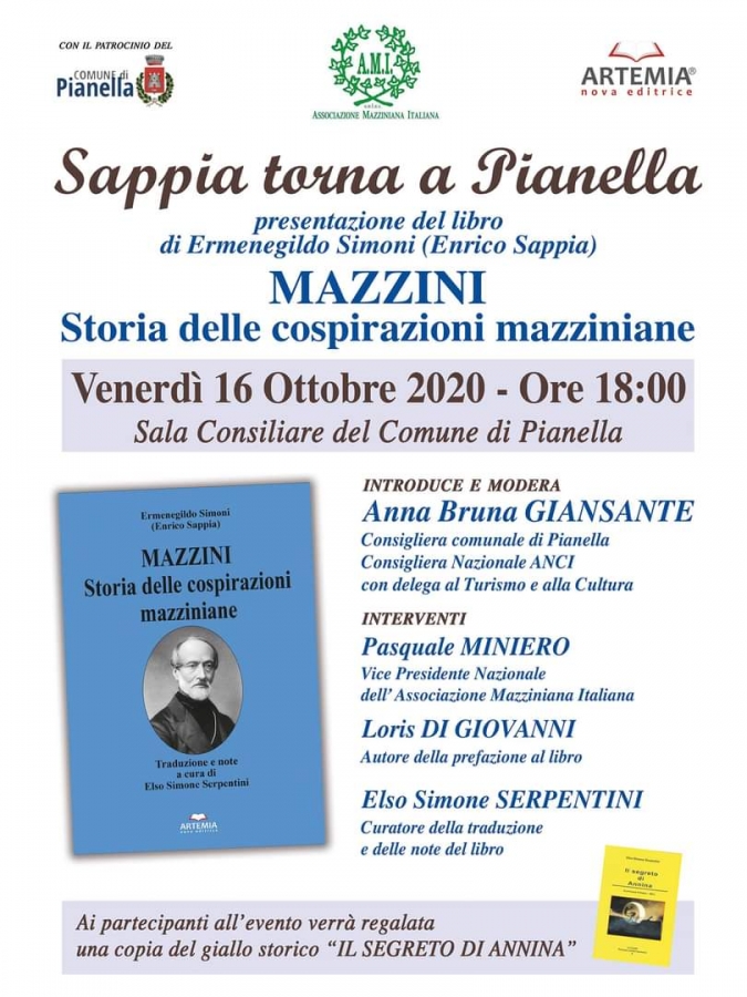 Continua il ciclo degli eventi organizzati dalla consigliera Anna Bruna Giansante con la presentazione venerdì 16 ottobre alle 18.00 nella sala Donato Cavallone del Consiglio Comunale di Pianella del libro "Mazzini. Storia delle cospirazioni mazziniane", per i tipi di Artemia Nova Editrice di Teresa Orsini. Trattasi della prima traduzione in italiano di un testo francese pubblicato a Parigi nel 1869 dall'agente segreto di Mazzini, Enrico Sappia, sotto lo pseudonimo di Ermenegildo Simoni a cura del professor Elso Simone Serpentini, che sul nizzardo ha pubblicato nel 2009 la prima biografia, "Enrico Sappia. Cospiratore e agente segreto di Mazzini", scritta a quattro mani con lo storico Maurice Mauvielle e " Gli scritti abruzzesi" nel 2016. Volumi entrambi presentati a Pianella, il primo nella sala consiliare, il secondo alla Società Operaia di Mutuo Soccorso.