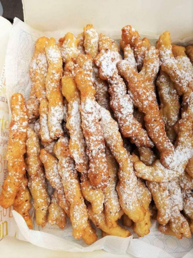 Procedimento:impastare il lievito con un pò di farina e acqua e far lievitare per un'ora. Lessate le patate con tutta la buccia, dopo cotte sbucciatele e passatele al setaccio. Disponete la farina a fontana sulla "spianatoia", nel centro mettete le patate schiacciate, il lievitino, l'olio, il vino, un cucchiaio di zucchero e un pizzico di sale. Lavorate bene l'impasto, verso la fine cospargete la spianatoia di semi d'anice e continuate a impastare incorporandoli poi copritelo con un canovaccio e lasciatelo lievitare per un'ora. Dopo la lievitazione dividete l'impasto in tanti bastoncini e friggete in olio caldo. Cospargete di zucchero a velo e consumateli caldi.