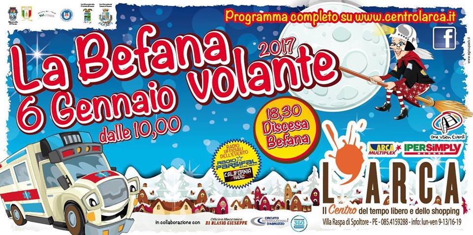 Con la collaborazione del Consorzio Arca, la One Vision Eventi e il Circuito D'Abruzzo, e con l'intervento della Misericordia di Pescara e le Forze dell'Ordine e il patrocinio del Comune e della Provincia di Pescara torna la Befana Volante del Centro Commerciale L'Arca; una giornata da vivere insieme tra giochi, musica, solidarietà , animazione e tantissimo divertimento per tutta la famiglia. Si partirà il 6 gennaio con l'apertura di Pompieropoli alle 10:00, un evento a cura del Circuito Internazionale D'Abruzzo per tutti i bambini che potranno fare un giro sulle potenti auto da corsa guidate da piloti, con dimostrazione di manovre PBLS.