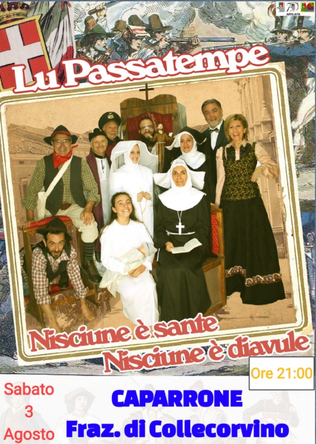 Torna il teatro vernacolare a Collecorvino, in particolare in contrada Caparrone. L'appuntamento è fissato per questa sera a partire dalle ore 21.00, quando sul palco salirà la compagnia teatrale " Lu Passatempe" con lo spettacolo " Nisciune è sante, nisciune è diavule".